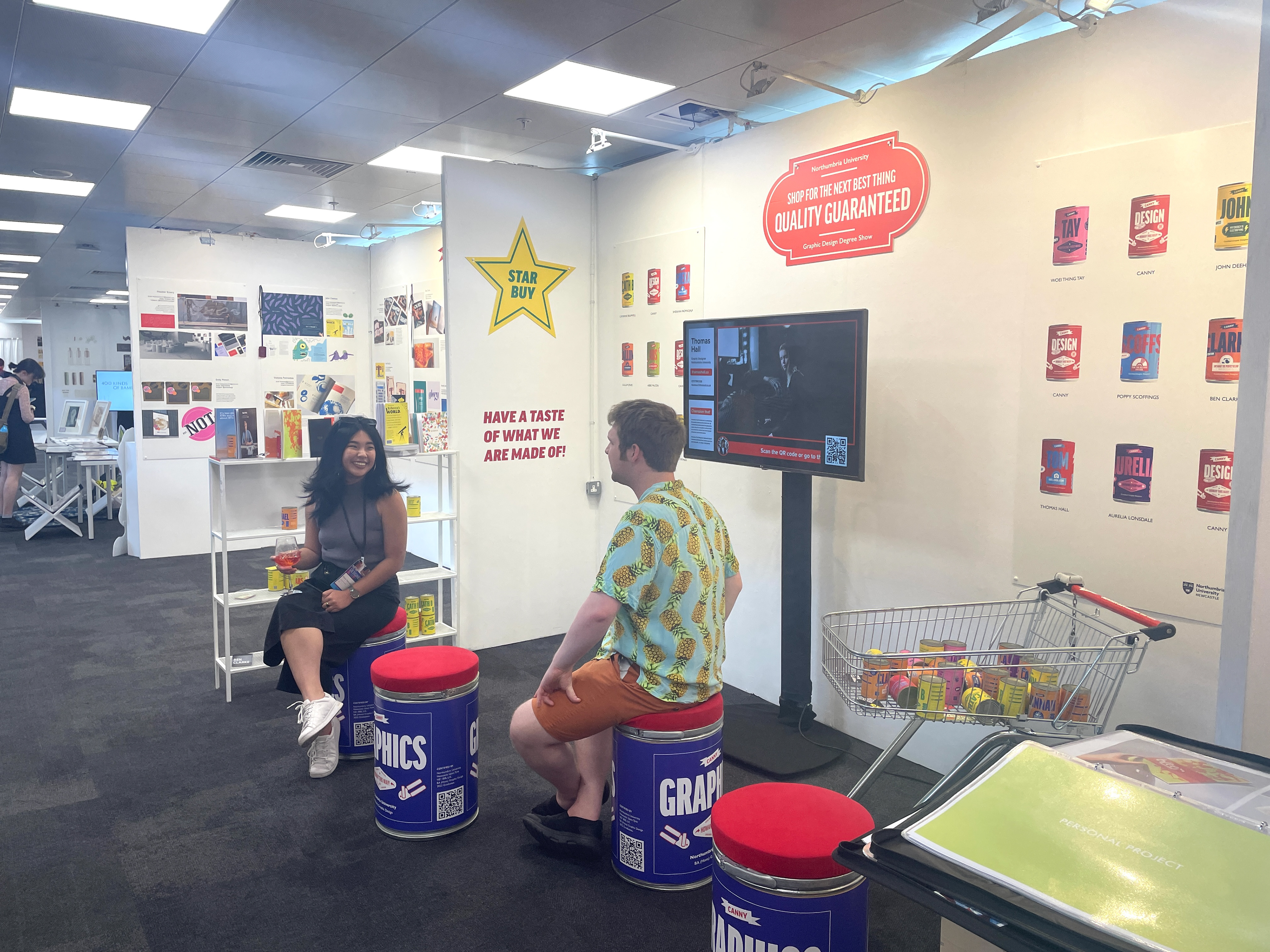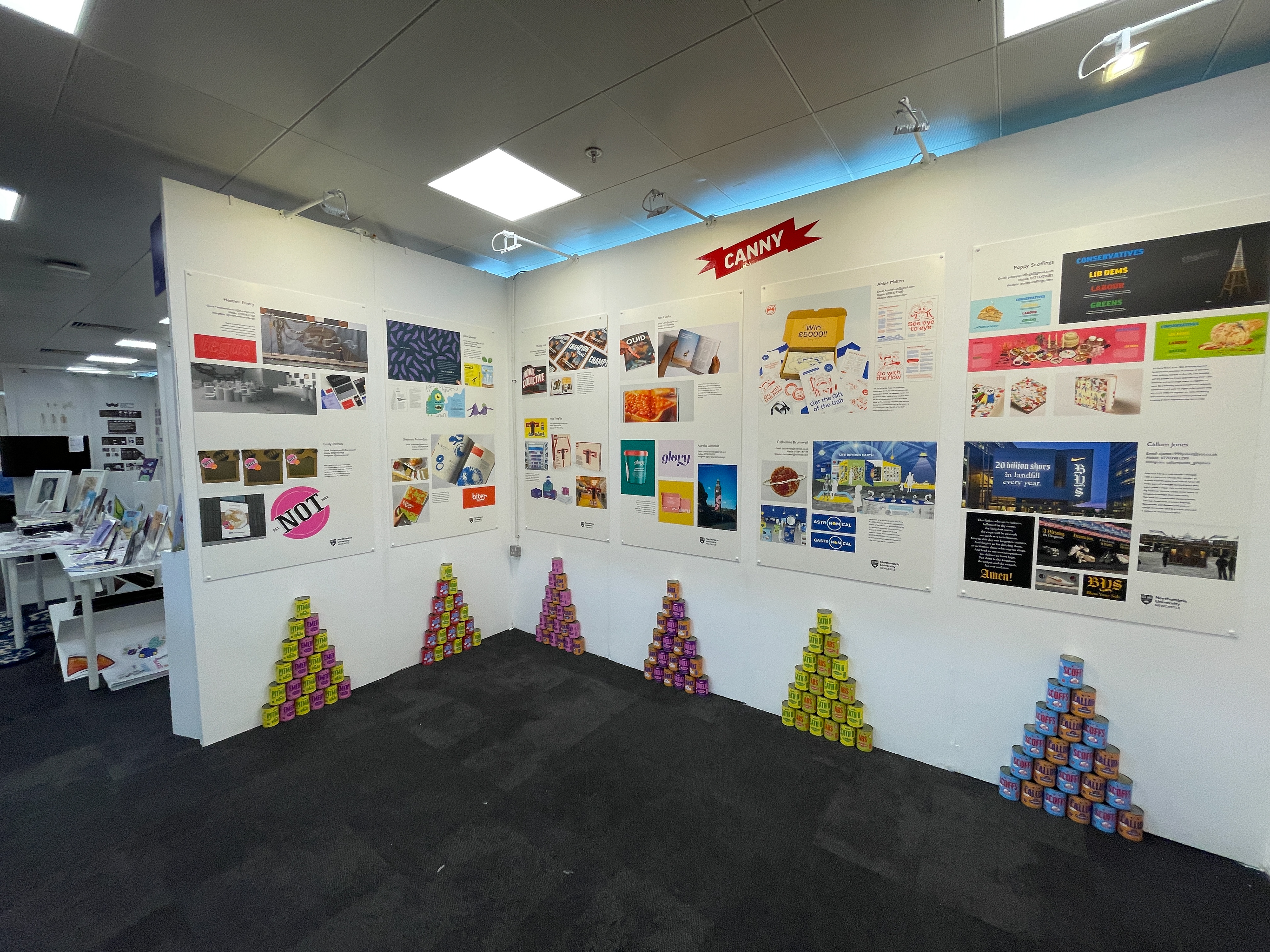 Since the Northumbria degree shows are set out in aisles, it made sense to extend the idea of selling and advertising oneself to professionals by replicating a supermarket shopping experience. The show was designed to be fun, vibrant, and memorable.